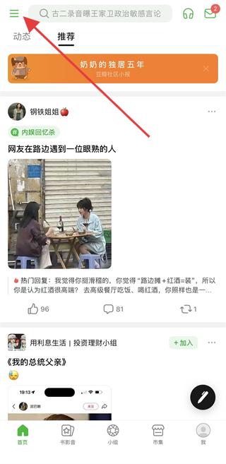 1、打开豆瓣APP,点击左上角三条横线图标,展开功能菜单。