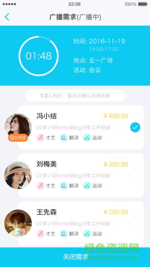 3.你可以浏览助理选者心仪的助理直接约人,也可以发布你的需求,通过系统广播来寻找适合的助理人员供你挑选,选中之后直接约人