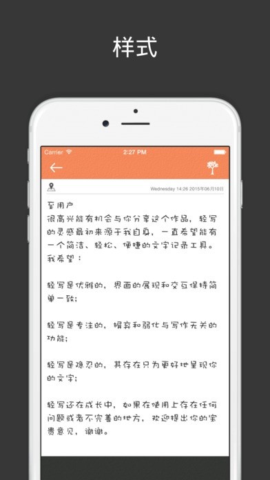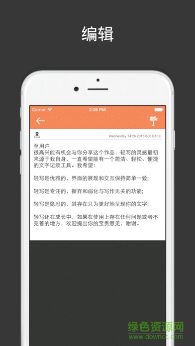 轻写是一款轻量级的文字书写工具,专注于写,并且保持自身的简洁和优美,只为你能在需要的时刻使用它,轻松方便地记录下来自你的工作、生活以及脑海中的各种灵感或者思绪。重要的不是轻写本身,而是记录在轻写中属于你的珍贵的时光印记。