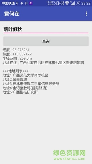 君何在app是一款超级方便使用的定位软件。无论走到哪,你都能通过用户名找到她,再也不怕她遇到坏人啦,软件每两分钟获取数据,软件简单到不行,想要正常使用就给它获取位置权限哦。来绿色资源网下载这款软件,方便你的手机使用吧。