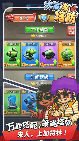 帅气的英雄们充满魅力,他们将是你战斗的一把好手。每个英雄都带有不同的攻击技能和被动效果,合理搭配英雄和炮塔,适时释放英雄技能;会大幅降低战斗难度,爽快通关。