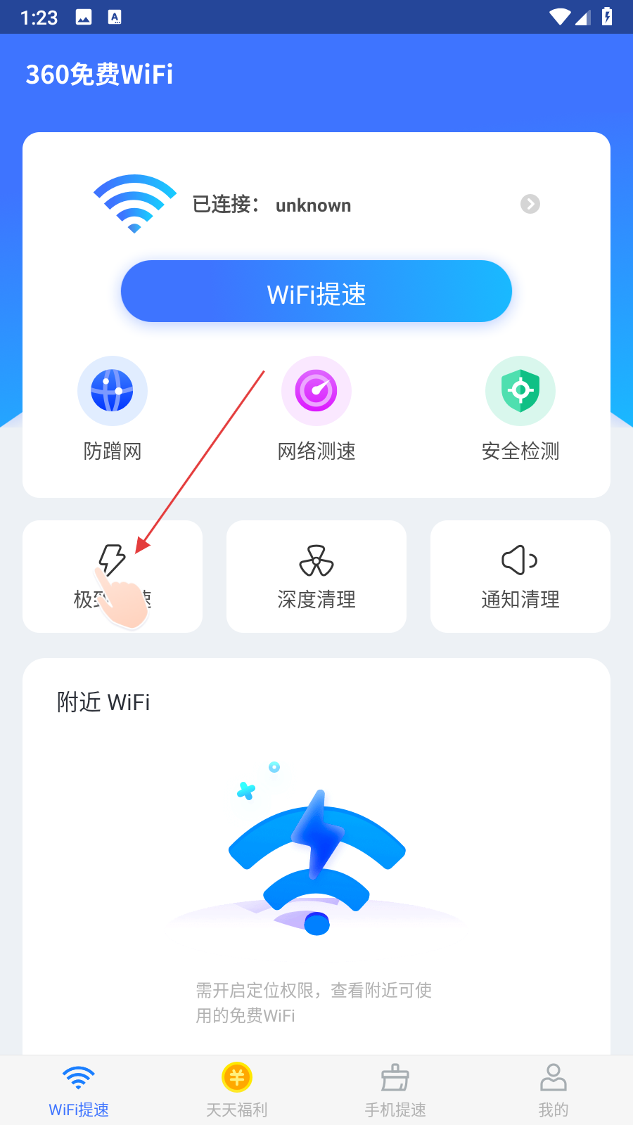 1、打开360免费WiFi应用,在主界面找到极致加速功能按钮,点击该按钮进入极致加速页面。