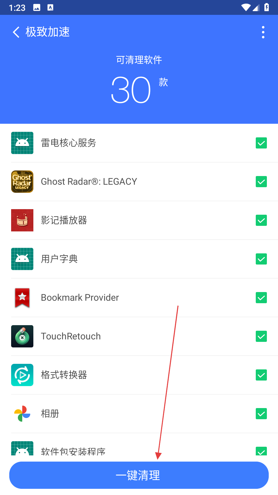 2、进入极致加速页面后,能看到可清理软件的数量及具体软件名称,确认需要清理的软件后,点击页面底部的一键清按钮。