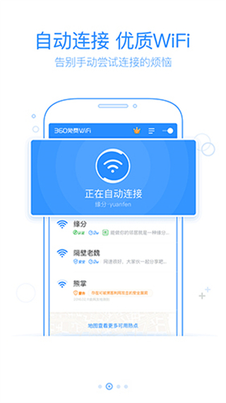 360免费wifi手机版是一款专业的wifi连接工具,由奇虎360官方推出,提供免费wifi热点的连接,支持一键快速连接,让用户走到哪都能便捷上网,同时具备WiFi安全性检测功能,可精准识别并规避钓鱼WiFi等风险,保障上网安全,整体操作简单易上手,切实解决外出时的上网需求,有需要的用户可直接下载体验。