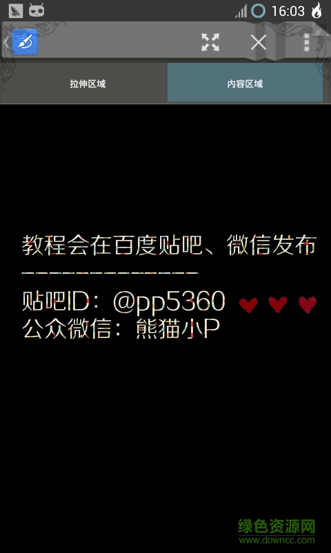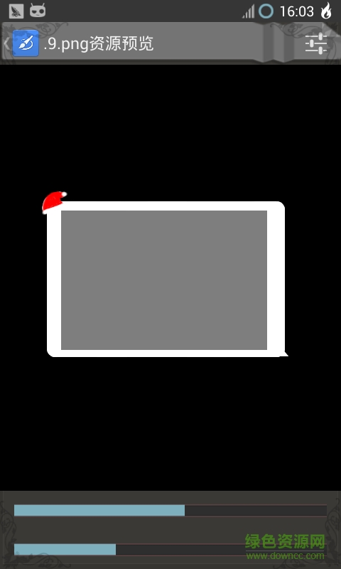 一个简单的.9.PNG 编辑器。这个程序可以用于编辑制作Android程序或主题所必须的 .9.png资源图片。拉动彩条或彩框即可确定各个方向的黑色像素。