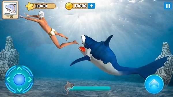 玩家化身为深海中的一条大白鲨,目标是袭击海边沙滩上度假的人群,大白鲨目前的状态是非常饥饿的,需要源源不断地猎杀食物,否则就会因为体力不支而倒下。站在食物链顶端的你,让那些浑然不知危险已然降临的人类颤抖吧!