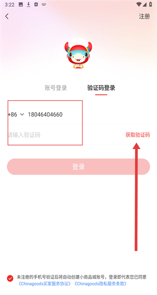 4、验证码登录页输入手机号,点击“获取验证码”,输入收到的验证码后完成登录。