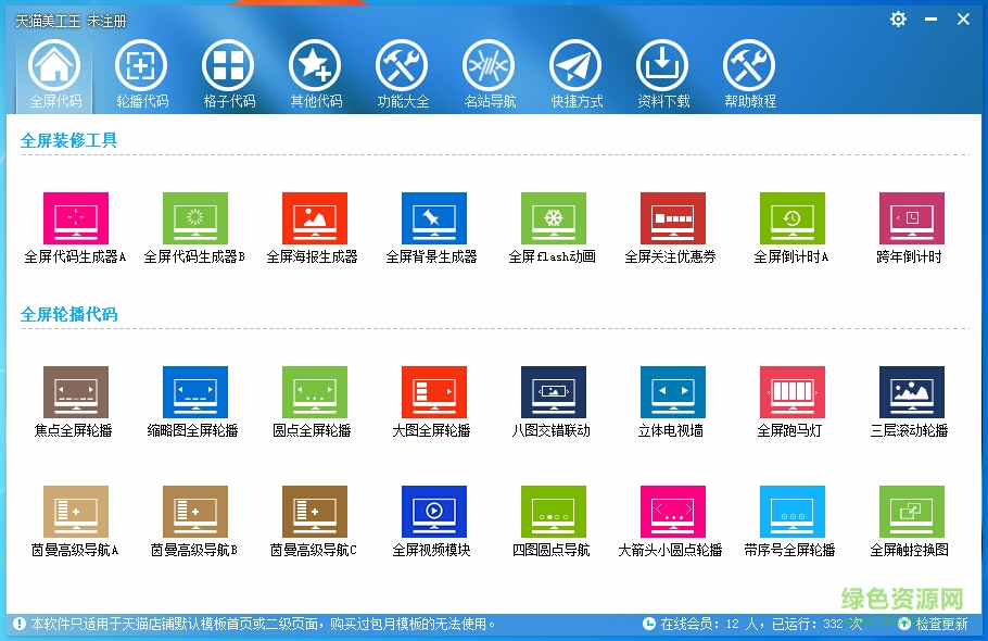 天猫美工王是一款功能强大的天猫店铺装修软件,提供全屏代码、轮播代码、各自代码、功能大全等多个模块,可以快速的帮助用户进行店铺设计,完全免费使用,需要的朋友欢迎来绿色资源网下载!