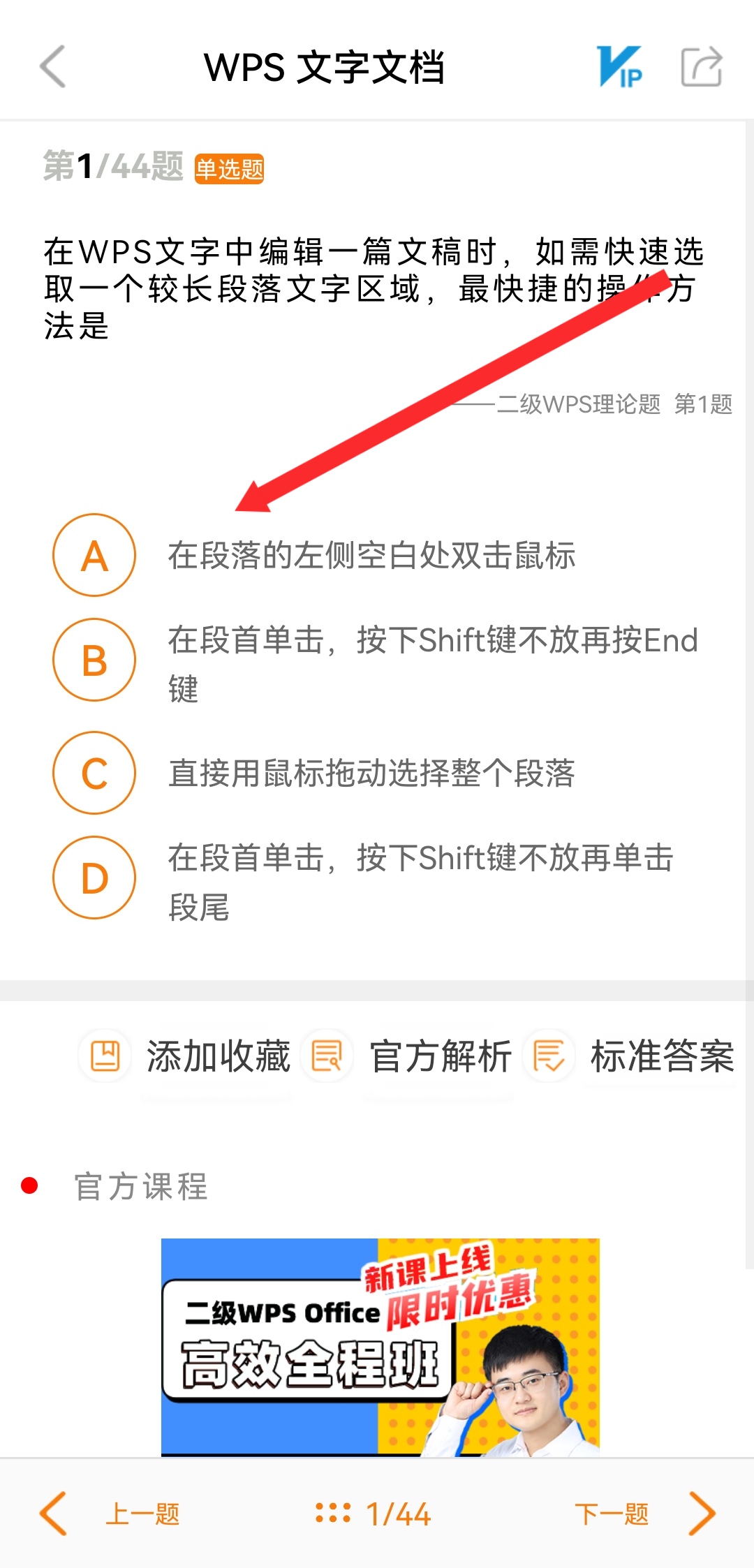 4、在WPS文字文档练习页面,即可开始刷题,如关于选取段落的单选题。