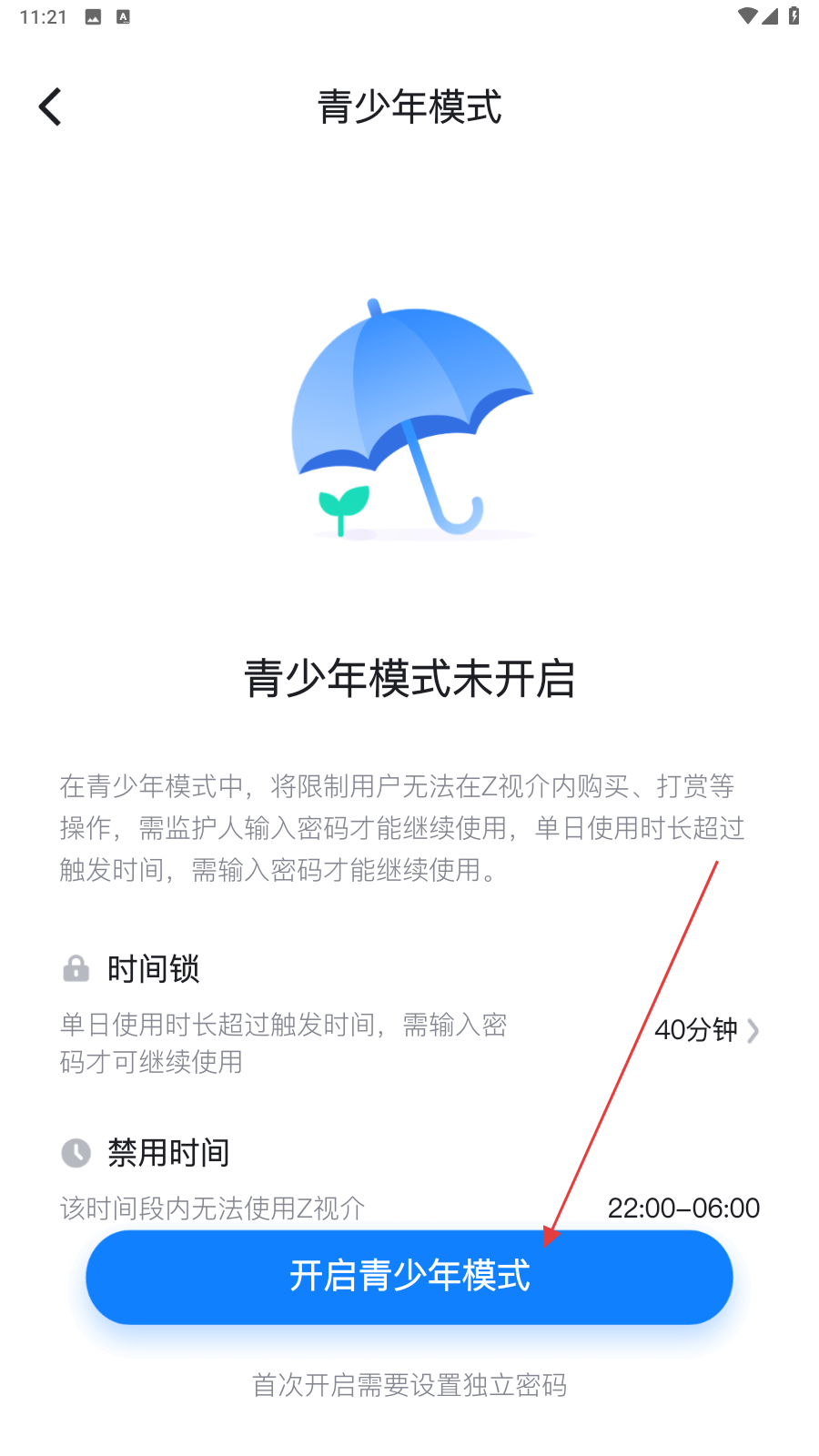 4、当前显示未开启,仔细阅读后设定时间锁再点击开启青少年模式即可。