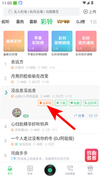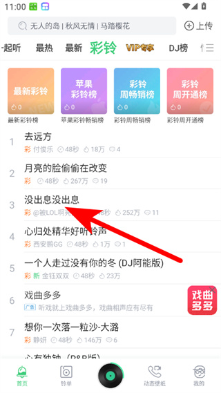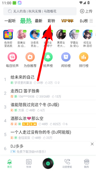 1、在铃声多多首页,点击上方彩铃选项,进入彩铃专区。