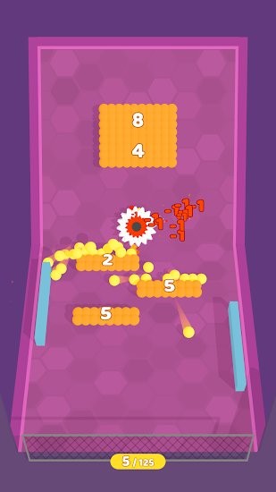 3、避开滚轮再次射到圆盘上,圆盘就会炸裂分散出很多小黄球,为你增加小球的数量,数字越大,爆出的小球就越多。