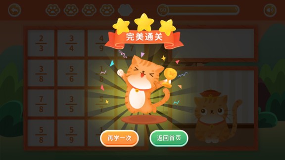 在规定时间内,找到相加为1的两个分数,选出来即可,鲜艳、生动的画面符合5-8岁小朋友的审美,提高练习的兴趣,达到分数的相加的目的。将对数学口算的要求与游戏机制相结合,提高孩子的速度与正确率,告别枯燥练习,更有趣!