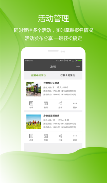 用户快速完成活动的组织,通过发起活动来让他人参与其中,免去了手写记录的麻烦,包含有报名、签到及统计等诸多功能,并且还能快速分享给他人。