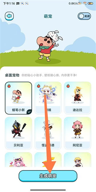 3、在萌宠选择界面,选择喜欢的萌宠后点击生成萌宠按钮,完成桌宠设置操作。