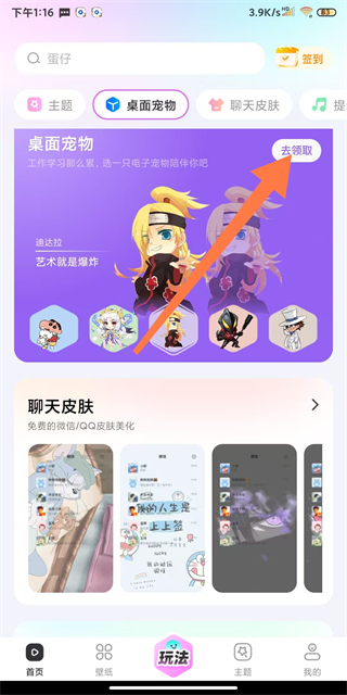 2、在桌面宠物页面,点击去领取选项,进入萌宠选择界面。