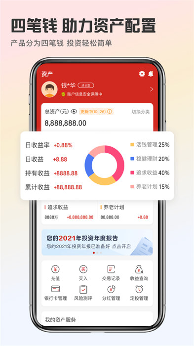 银华生利宝app是一款非常便捷的金融服务手机软件,这里汇集了丰富的理财产品,选择性多,支持组合投资,安全保障强,喜爱的朋友赶快到绿色资源网下载体验吧!