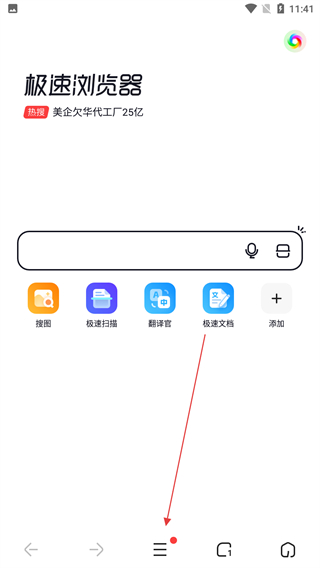 1、打开360极速浏览器,点击底部的三条横线菜单按钮。