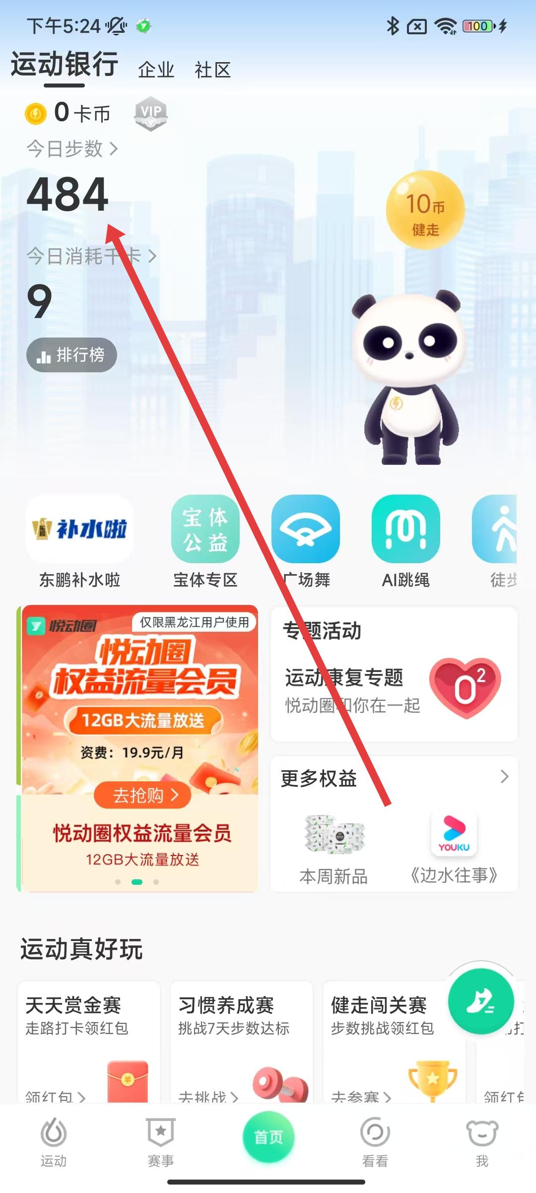 1、打开悦动圈APP,在首页点击上方「今日步数」区域,进入运动选择界面。