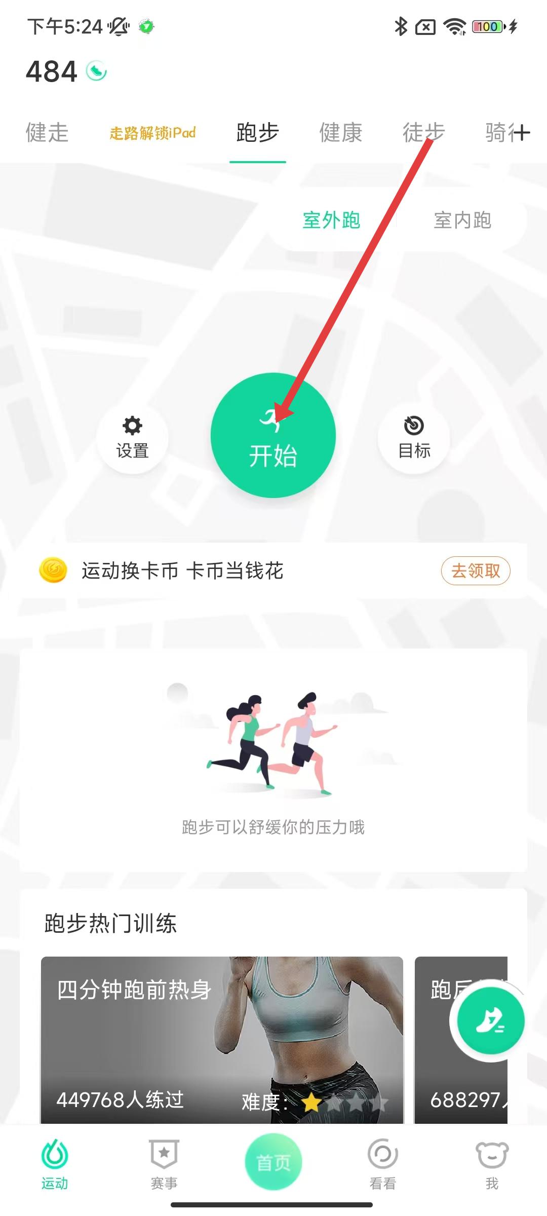 2、滑动切换运动模式,如跑步切换室外跑,点击中间绿色「开始」按钮,启动运动监测。