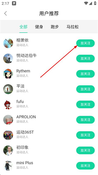 4、选择想要关注的运动达人,点击其右侧的加关注,即可添加为好友。
