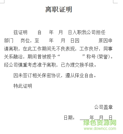 离职证明是当你想换工作或正常辞职时,由从业单位出示的一款证明文件爱你,用来解除你与单位件的合作关系或劳动合同,绿色资源网提供标准版,欢迎下载!