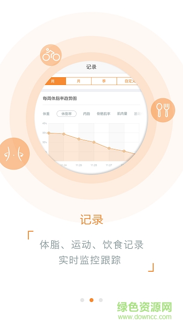 1.点击首页右侧的第一个橙色图标,进入下一个页面。在这里,您也可以通过点击右侧第二个橙色图标,进入饮食记录页面,快试试吧。