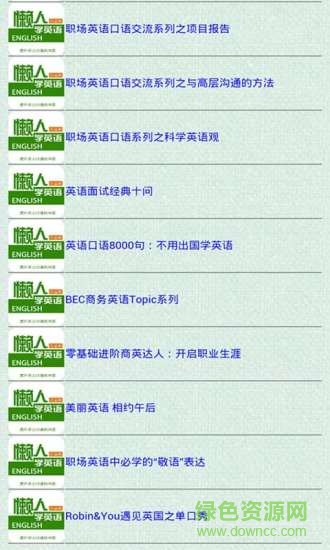 懒人学英语神器是一款商务英语学习手机软件,主要训练用户的口语水平,这里有丰富的商务英语资源,用户可以在线听听力也可以离线下载,随时随地想听就听,喜爱的朋友赶快到绿色资源网下载使用吧!