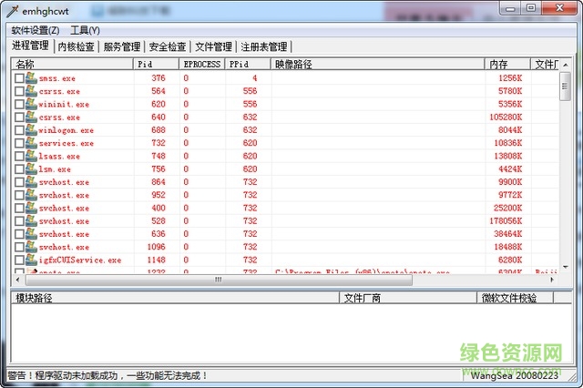 2.关于Wsyscheck启动后状态栏的提示“警告!程序驱动未加载成功,一些功能无法完成。”