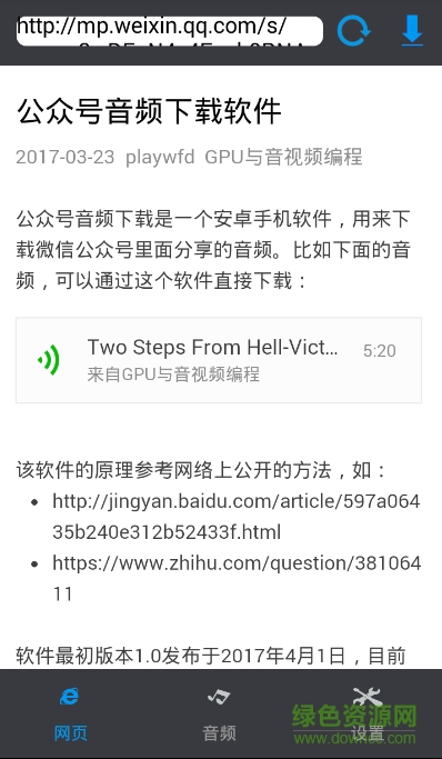 公众号音频下载是一个安卓手机软件,用来下载微信公众号里面分享的音效,可以通过这个软件直接下载。