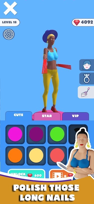 长指甲跑酷3D有着魔性的跑酷玩法,游戏中的主角是一位指甲超长的小姐姐,你需要帮助她成功通过关卡赛道,路上会遇到很多彩色指甲,捡起来能够让自己的指甲变长,同时也要小心躲避指甲剪,最后到达终点的长度决定了你的分数。