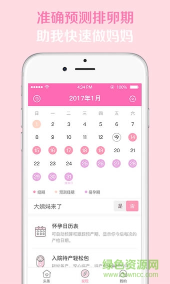 大姨妈记录、排卵期计算、怀孕日历、待产包清单等,简单实用。