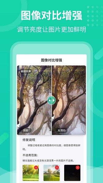 照片修复、对比增强:在线修复图像照片,调整过暗或者过亮图像的对比度,让图片变得更清晰,焕然一新。