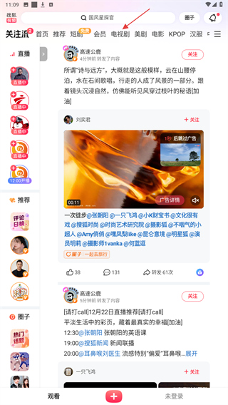 1、在关注流页面中可以看到很多时下热门的直播的视频,都是根据用户口味进行推荐的,可以进行筛选关注。