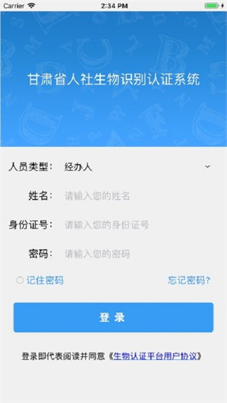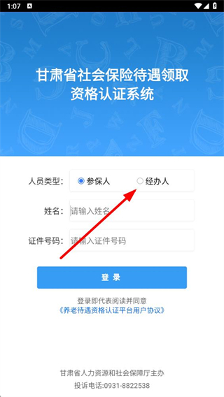 1、进入系统界面后,在人员类型选项中选择经办人,切换至经办人登录模式。
