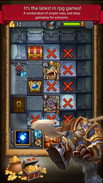 《地牢爬行2 Dungelot 2》是一款美式风格相当强烈的卡牌冒险游戏,在玩法上也是相当特别。玩家可以从数名角色中选择一个,通过类似踩地雷的方式翻开关卡中的每一道方块,其中可能是怪物或者宝物,玩家可以通过不断地战斗与探索来让自己的角色更加强大,并试图挑战向下深入到更底层的地牢。