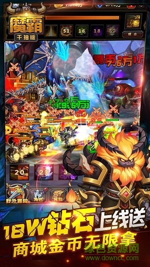 1.上线赠送满V,钻石*188888,金币*188888888,5星恶魔术士*1,5星英雄宝箱*1(背包领取);