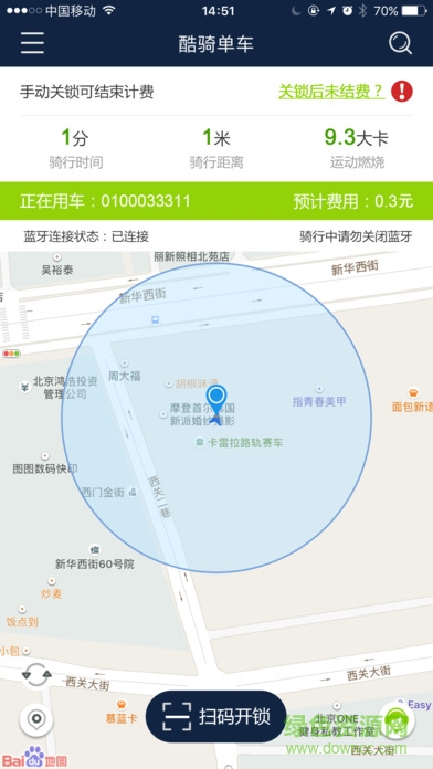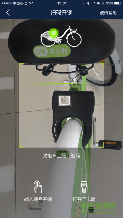 1、手机扫码,智能开锁。扫描车身或车锁上的二维码,即可智能开锁