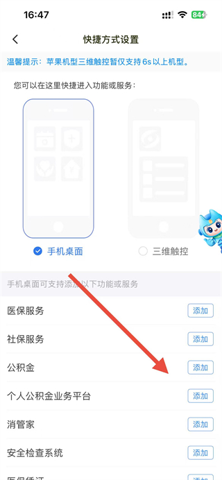 4、在页面选择手机桌面,再点击对应功能右侧的添加按钮,即可将闽政通相关功能添加到桌面。