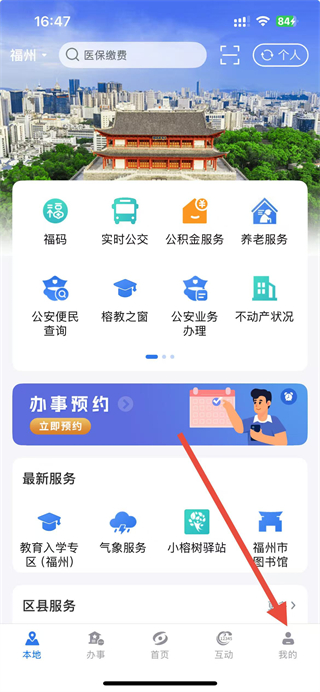1、在闽政通app首页,点击右下角我的按钮,进入个人页面。