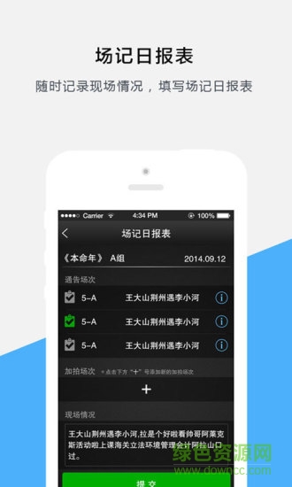 3.场记人员可随时在软件中记录现场拍摄情况,填写场记日报表;