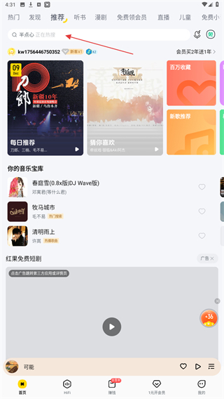 1、打开酷我音乐APP,点击页面顶部的搜索栏。