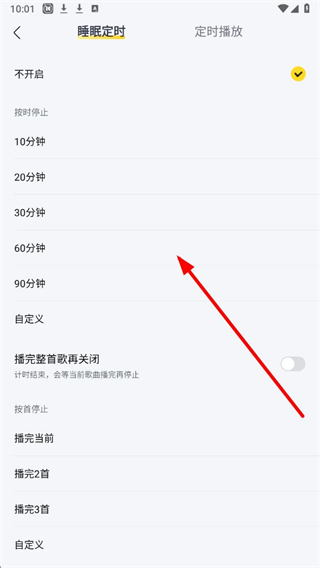 4、在睡眠定时设置页,根据个人选择时长,即可设置定时关闭功能。