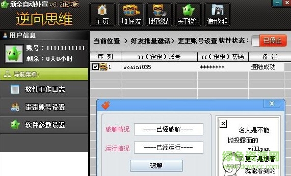 本歪歪外宣软件由逆向思维工作室制作,主要针对YY宣传这一块,避免繁琐的人工,全自动加好友,全自动邀请,全自动添加邀请码,是一款非常给力的外宣软件,希望对大家有所帮助