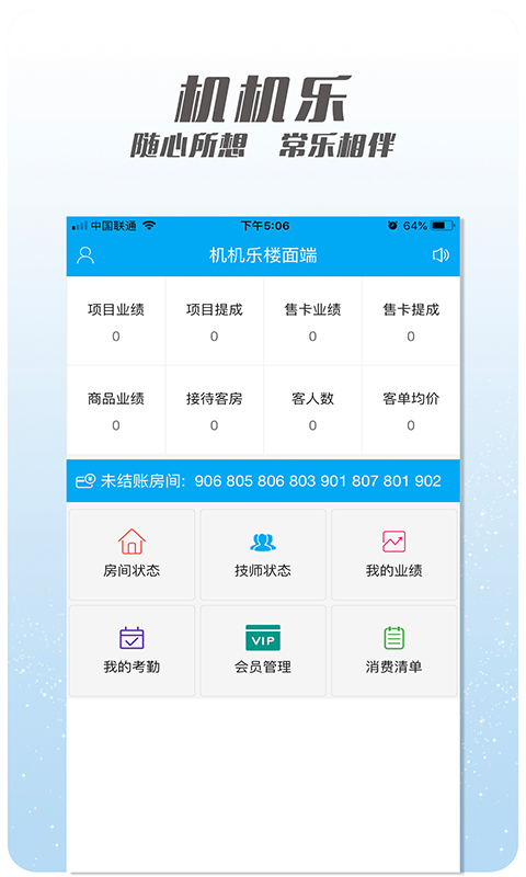 机机乐楼面端小巧灵活,功能强大的技师好帮手,结合机机乐技师端app使用,自动排钟,上下钟提示,预警通知,考勤打开,业绩查询,都能通过“技师小秘”轻松搞定。