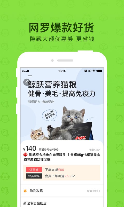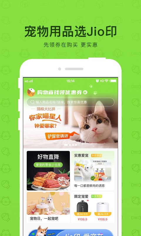 jio印-专为爱宠人士设计的导购电商平台,购物领券,省钱又省心,养宠人士必备app,让你以更低的价格,去买的你心仪的各种的商品,整个的购物的体验感都是非常的不错的。