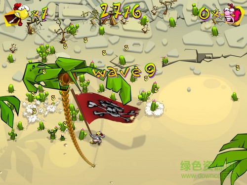 游戏主角是一只小鸡,为了报仇,它毅然拿起了手中的武器,进行奋力的反抗。游戏的目的是利用手中的猎枪。击退一批又一批来攻的敌人,一旦失手,将会变成敌人的美餐。当一个敌人被打死的时候,他会变成一棵仙人掌,有时还会出现金色的仙人掌哦,可以打出一些宝石、金币,接到后可以增强武器装备,游戏中还需要注意两边的敌人哦,稍不留神就会被压扁。