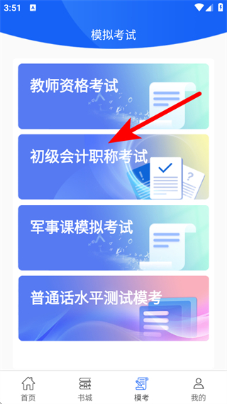1、在模考的页面,选择初级会计职称考试,进入考试分类页面。