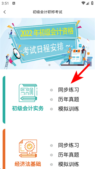 2、在考试分类页面,点击同步练习,进入科目练习选择页面。