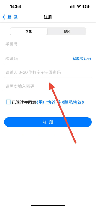 3、在页面选择身份,输入手机号、验证码,设置密码,点击注册即可。